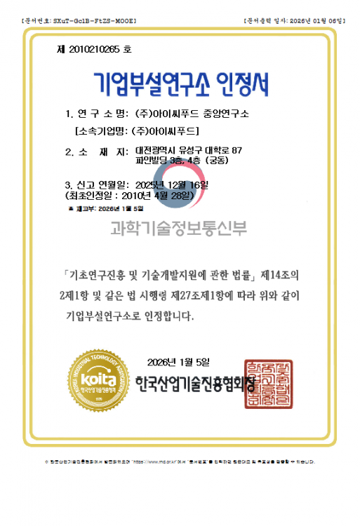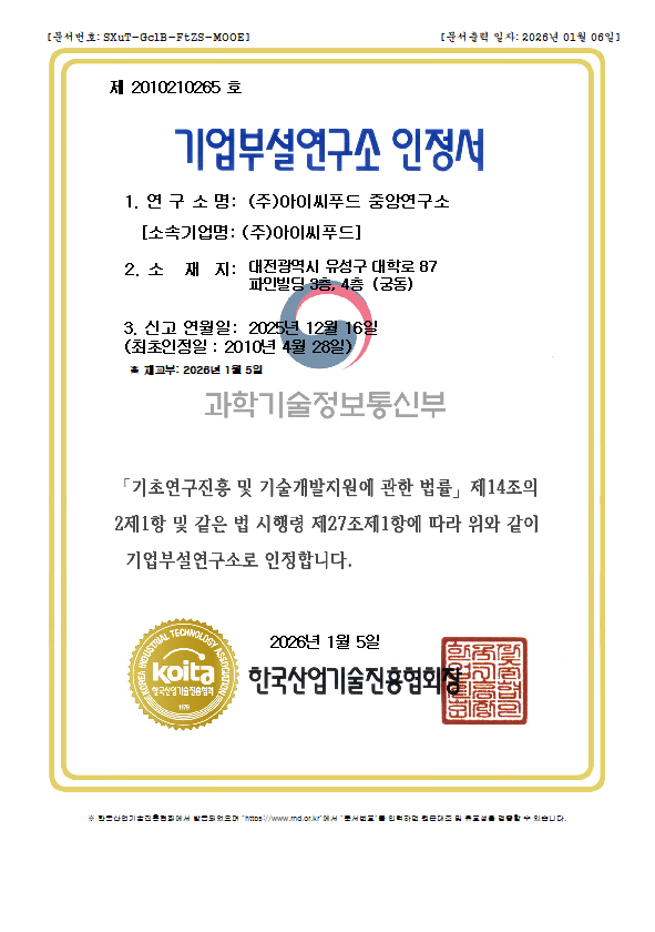 이미지를 클릭하시면 계속해서 발전하는 글로벌 기업 (주)아이씨푸드의 특허 및 인증서를 좀 더 크게 보실 수 있습니다.