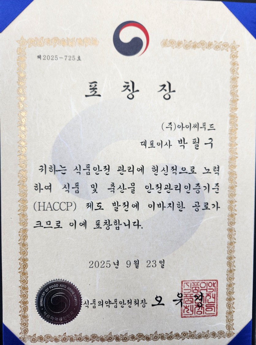 아이씨푸드는 앞으로도 식품안전 제도 발전과 안전한 먹거리 환경 조성을 위해 노력하겠습니다.